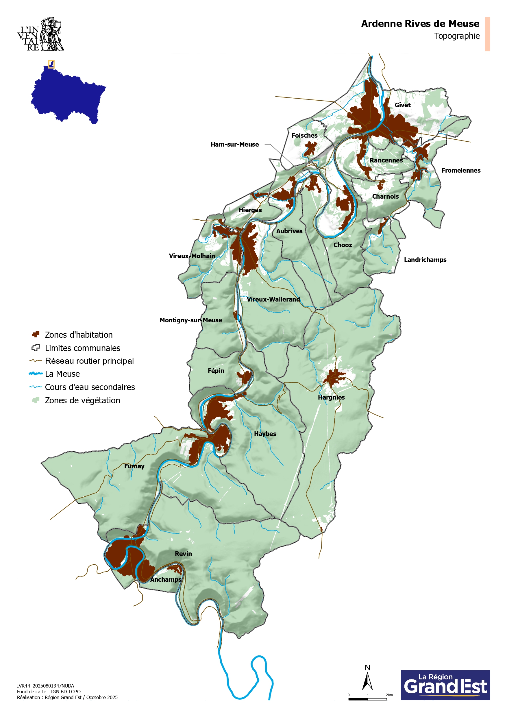 Le territoire concerné, connu comme la « pointe de Givet », regroupe 19 communes, situées à l’extrême nord du département des Ardennes. Il correspond aux anciens cantons de Givet, Fumay et Revin. Son identité géographique est marquée par la vallée de la Meuse, dans un paysage encaissé typique du massif ardennais. La proximité de la frontière a également joué un rôle dans la constitution d’un patrimoine militaire emblématique. La diversité des matériaux de construction, tels que le schiste de Fumay et la pierre bleue de Givet, témoigne de l’exploitation locale des riches ressources géologiques. Le patrimoine naturel y est remarquable, massivement couvert par la forêt et complètement intégré au Parc naturel régional des Ardennes. L’importance de l’industrie a marqué durablement l’organisation urbaine et paysagère du territoire, faisant de la vallée un véritable « couloir industriel » propice à l’innovation technologique.